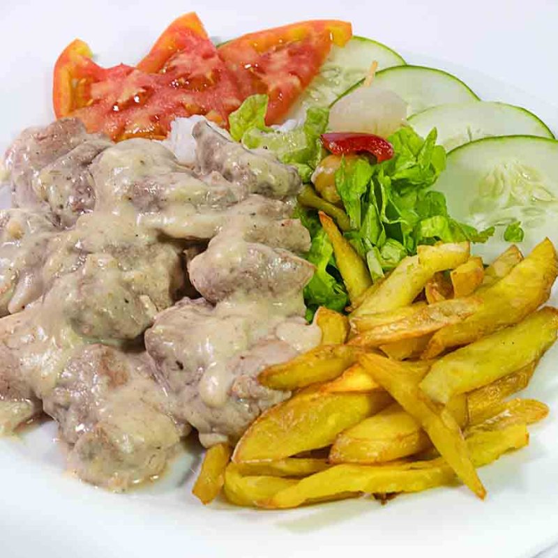 Solomillo cocinado a la plancha (230gr) acompañado de vianda frita y ensalada de vegetales de estación.