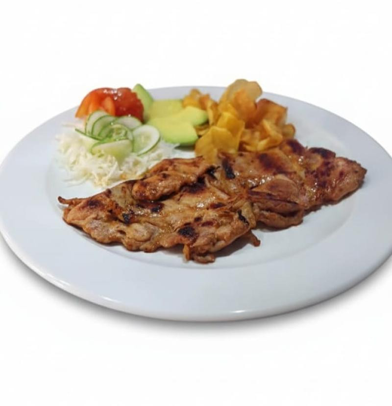 Bistec de pollo (230 g) con salsa a BBQ. Guarnecido con ensalada de estacion y viandas fritas. En la entrega a domicilio la presentacion del producto puede variar, manteniendo siempre la calidad y gramaje correspondientes.