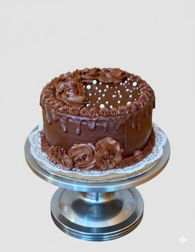 Ordenar con 48h de antelacion. Tamaño:20cm de diametro x 8cm de alto. De 10 a 12 porciones aproximadamente. Panetela de Vainilla o Chocolate según disponibilidad. Relleno de Leche condensada o Mousse de Chocolate según disponibilidad. Ganache: Mezcla de cobertura de Chocolate, mantequilla y crema. Capa fina interna de merengue. Decoración integra en Ganache de Chocolate Oscuro.