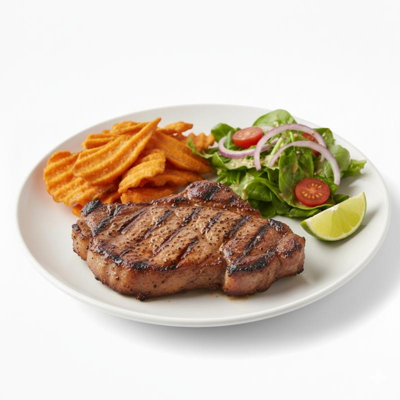 Chuleta de Cerdo Grille 460g. Acompañada de vianda frita y ensalada de estación. En la entrega a domicilio la presentación puede variar manteniendo siempre la calidad y gramaje correspondientes.