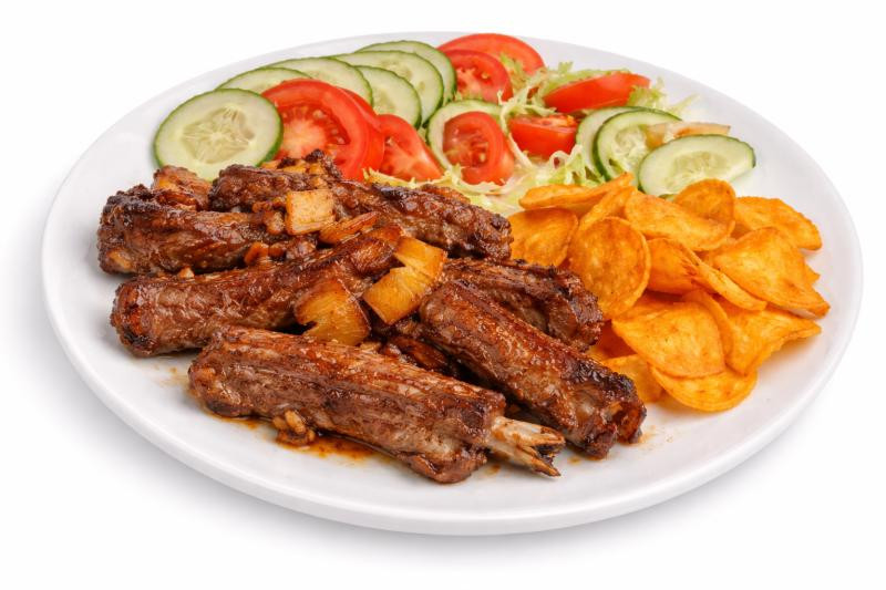 Costillas de cerdo (460g) aderezada con salsa agridulce y piña troceada, servidas con vianda frita y ensalada de vegetales de estación.