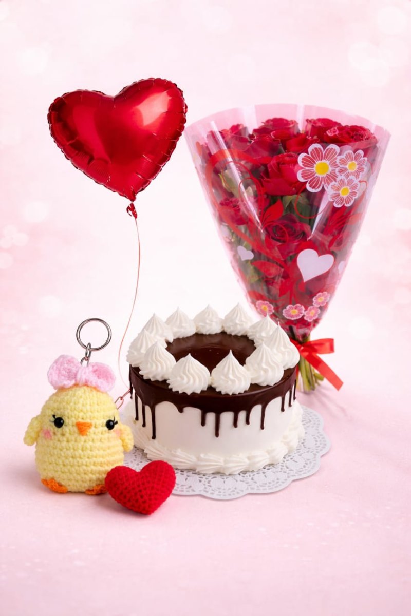 Día de Las Madres se entrega toda la Orden que incluya este Combo. Este regalo incluye: 1 Cake Cobertura de Chocolate, de Masa de Maicena relleno de crema de Chocolate. Ideal para 8 porciones. 1 Ramo de Rosas Naturales 1 Globo pequeño en forma de Corazón o estrella según disponibilidad 1 Llavero de Corazón Tejido, ideal para bolsos, mochilas y llaves. Incluye además como regalo de parte de la casa, un pollito tejido. Celebremos todos a mamá.