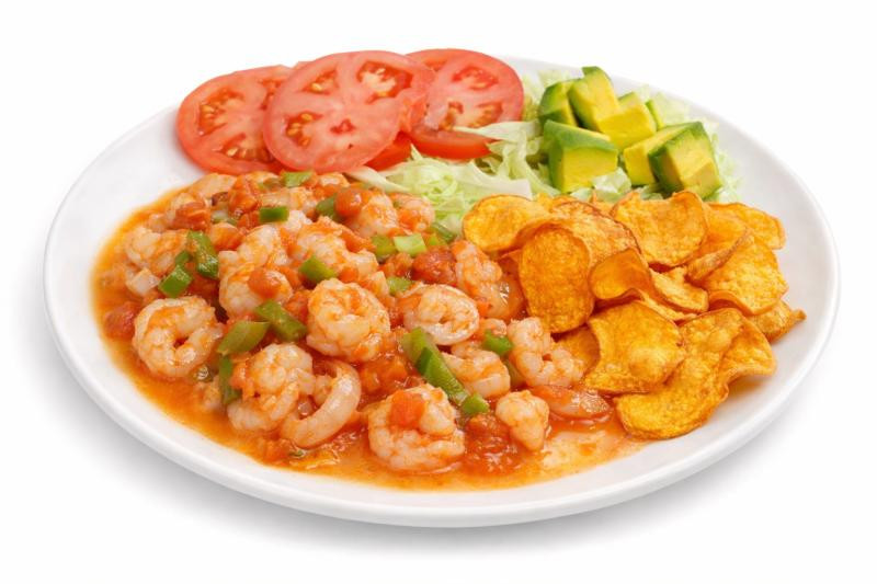 Típico enchilado de camarón. Acompañado de viandas fritas y vegetales de estación.