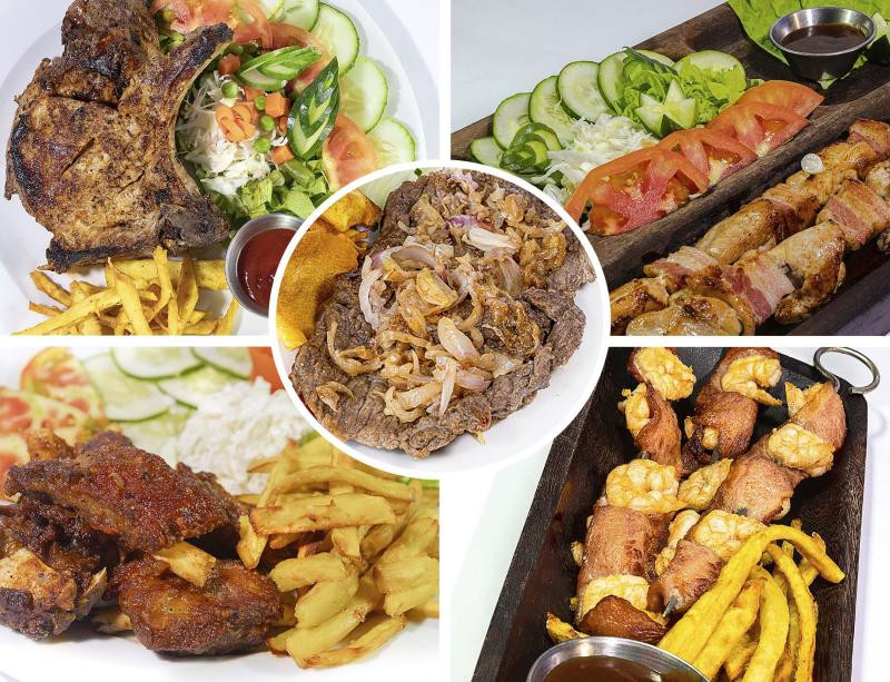 Este combo incluye una chuleta de cerdo bbq, una costillas de cerdo BBQ,un bistec de pollo BBQ, un bistec de cerdo encebollado y ropa vieja o camarón segun disponibilidad.