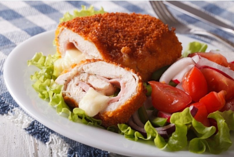 Bistec de pollo relleno con jamon y queso, empanado y dorado en aceite. Un plato delicioso. Acompañado de viandas fritas y vegetales mixtos. (En la entrega a domicilio presentación del producto puede variar manteniendo siempre la calidad, cantidad y peso correspondiente )