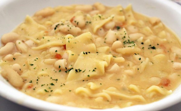Frijoles blanco, especias, romero, manteca, pasta corta, queso parmesano