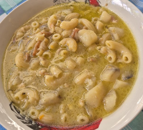 Papa, bacon especias, pasta corta, queso parmesano, queso gouda, queso de oveja