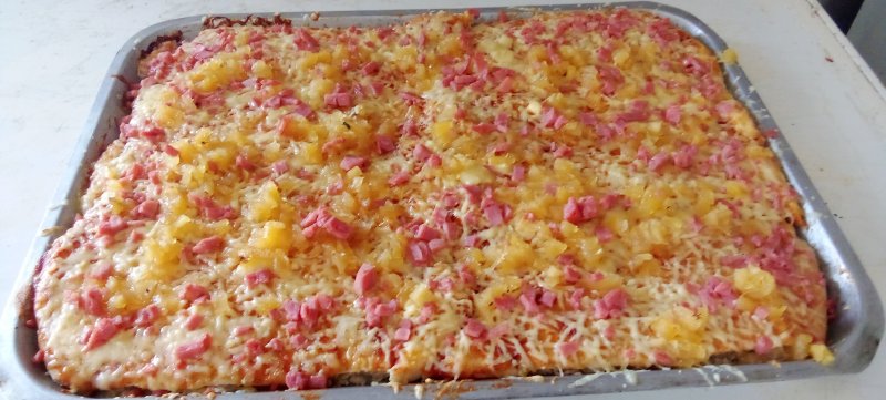 Disco de 33×45 con salsa napolitana queso jamón y dulce de piña