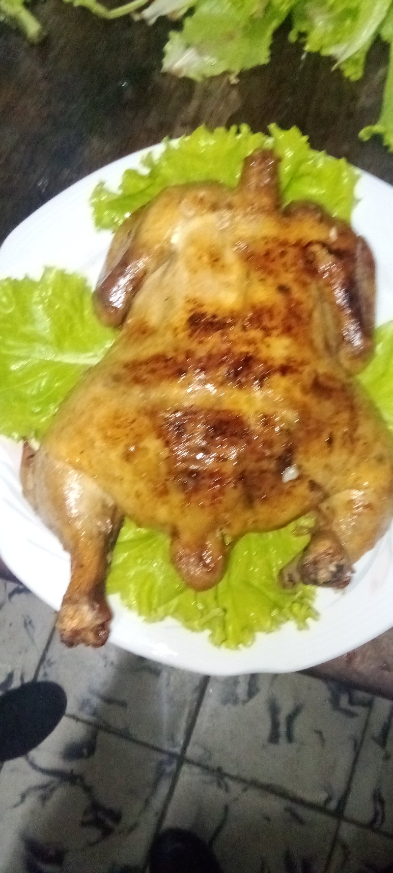 1 pollo asado relleno con jamón queso y vegetales acompañado de 4 raciones de congrís 4 vianda frita y 4 ensalada mixta