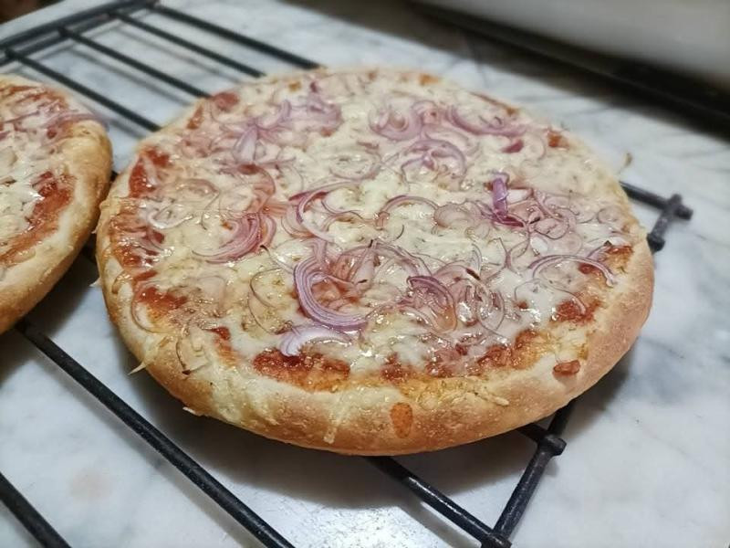 Base de salsa de tomate con hierbas mixtas y atún 80g queso blanco 70g y cebolla morada 30g